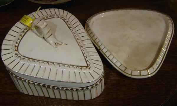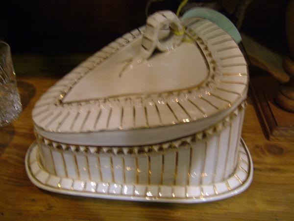 ce0955 A old ceramic, cream, with gold edging cheese dish with cover.