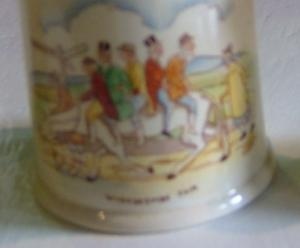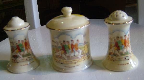 A old "Crown Devon" cruet set and marmalde/jam pot.