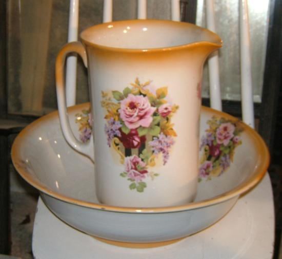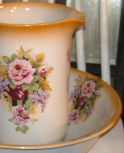 A old reclaimed jug and bowl set complete with a seperate soap dish, decorated with a floral design.