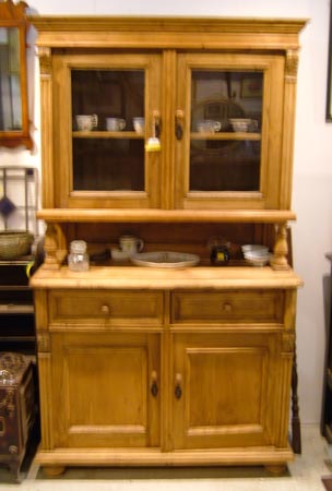 FU008 A refurbished pine dresser with 2 doors and drawers to the base and a pair of glazed doors to the top.