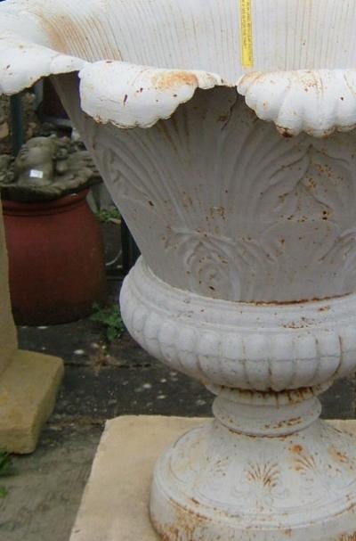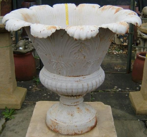 gp1212 A very large cast iron urn. With a raise pattern on sides and a fluted edge rim.