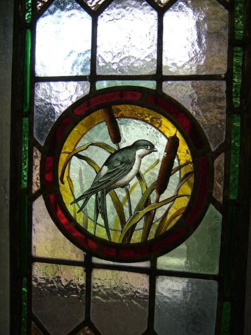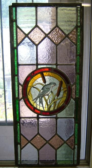 gl0908 An old rare piece of Reclaimed leaded stained glass , with a painted bird in the centre