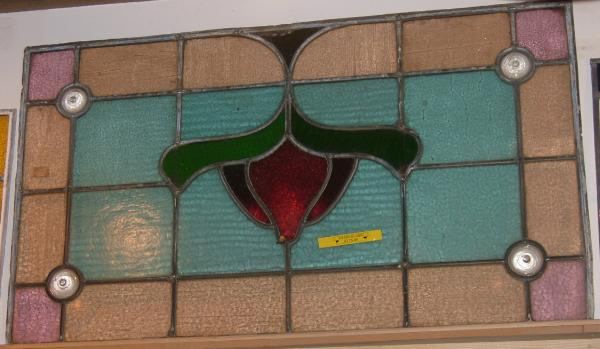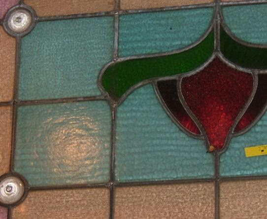 gl0813 a reclaimed, stained glass leaded light window with 4 small "Bulleyes" within it.