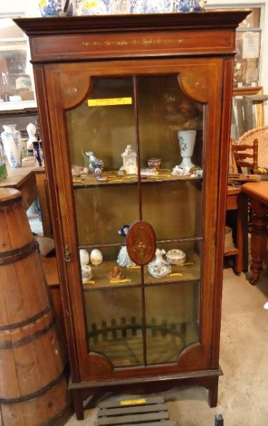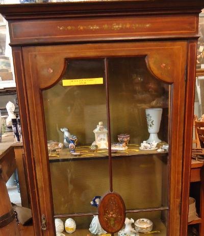fu132005 Reclaimed, tall display cabinet, with hand painted flowers, on the front of the cabinet.