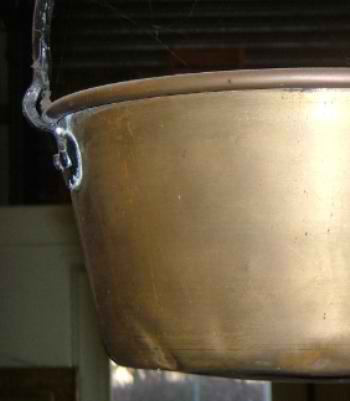 im0914 An antique, brass, preserving pan with cast iron handle.