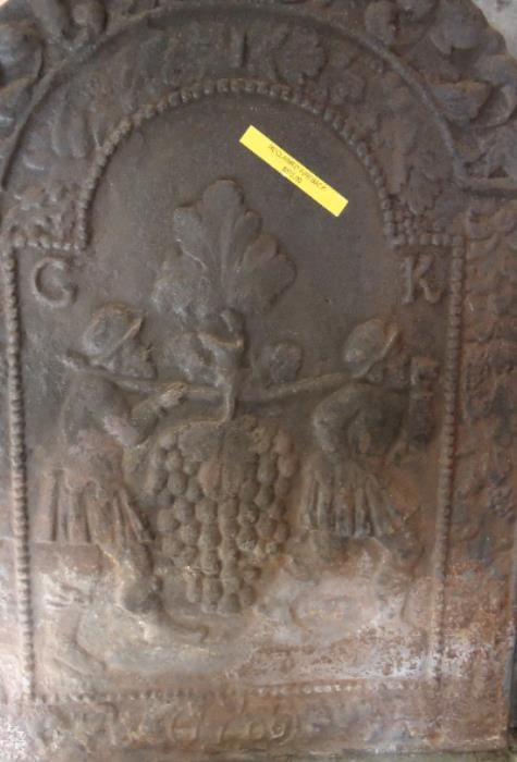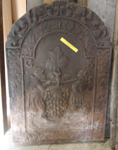 fp150001 A reclaimed cast iron fire back, with grape carriers.